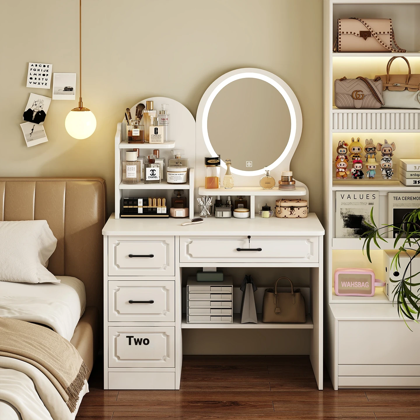 Modern Minimalist Makeup Vanity for Master Bedroom - 2025 New Luxury French Style Compact Dressing Table with Built-in Small Chest of Drawers