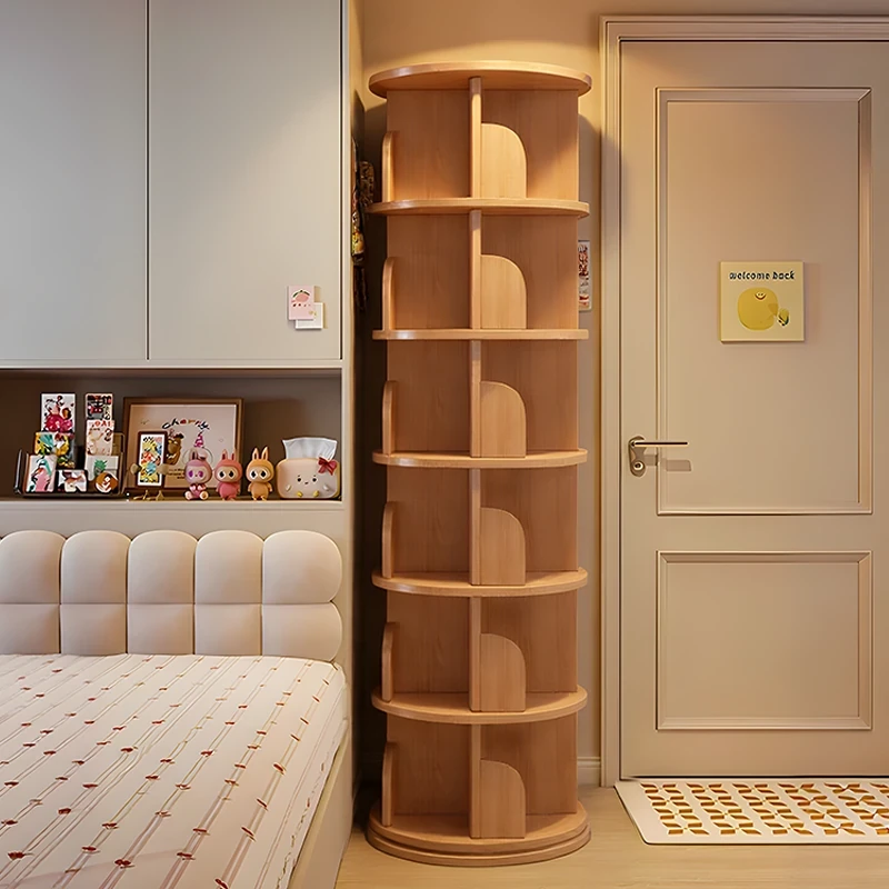 天然木材使用!回転式本棚 - 寝室向けフロア収納キャビネット。壁にぴったりフィットする円形デザインで、学生の角型本棚にも最適!おしゃれで機能的な収納スペースを実現します。