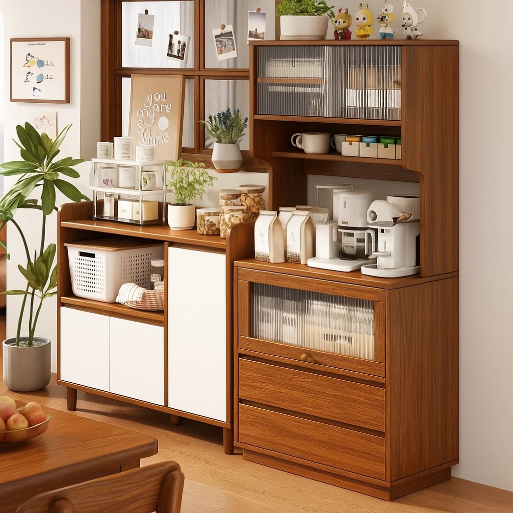 壁に寄せられる一体型収納キャビネット!新型2025年版ティーバー&ディスプレイシェルフ、スタイリッシュなデザインでお部屋をスッキリ整理!収納力抜群で、リビングやダイニングに最適なアイテムです。