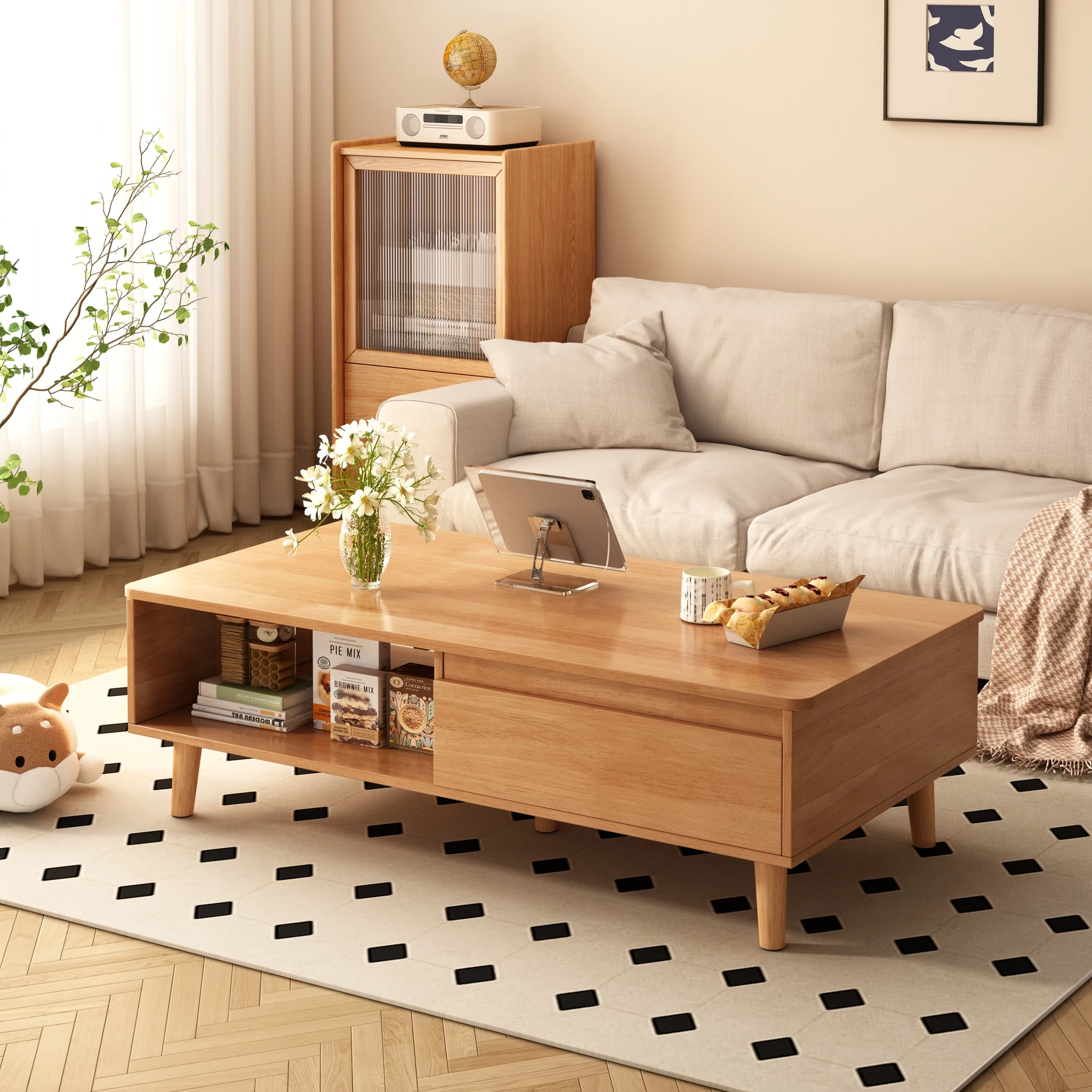 2025年新款!原木風のモダン&シンプルなリビング用茶卓 - 小型住宅に最適な収納付きソファテーブル!おしゃれで機能的な空間を演出します。