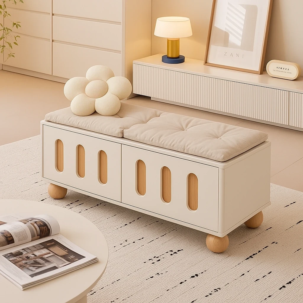 クリーム風のスリッパベンチ - 家庭用玄関マットに最適!座れる靴ラック一体型で、便利な収納スペースも兼ね備えた玄関用シューズベンチ。おしゃれで機能的、毎日の靴の脱ぎ履きが楽に!