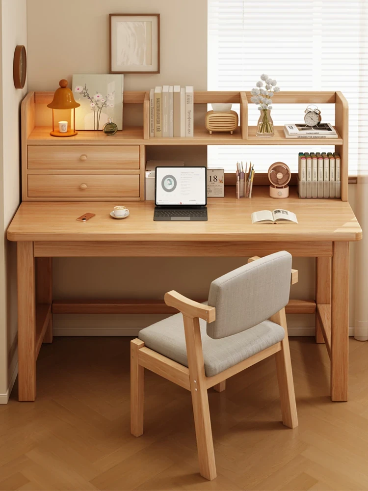 壁に寄せて使えるシンプルな無垢材デスク|家庭用パソコンデスク|書斎・寝室に最適|収納力抜群の学生用学習デスク|快適な書き心地を実現した一体型デスク