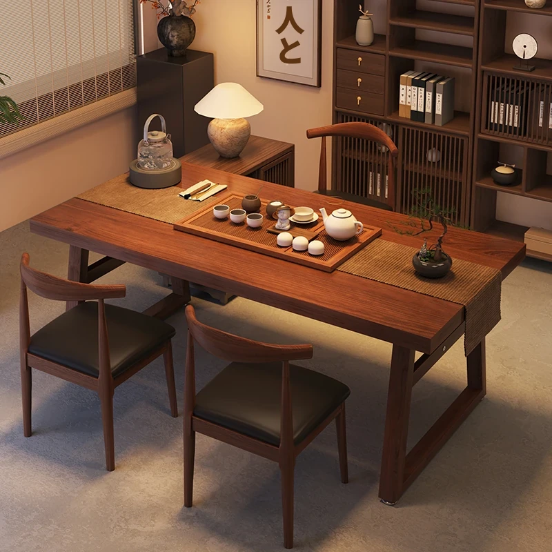 新中式スタイルの実木茶卓セット - おしゃれなオフィスや家庭用に最適!大きなテーブルと5脚の椅子で、ゆったりとしたお茶のひとときをお楽しみください。商談にもぴったりなデザイン!