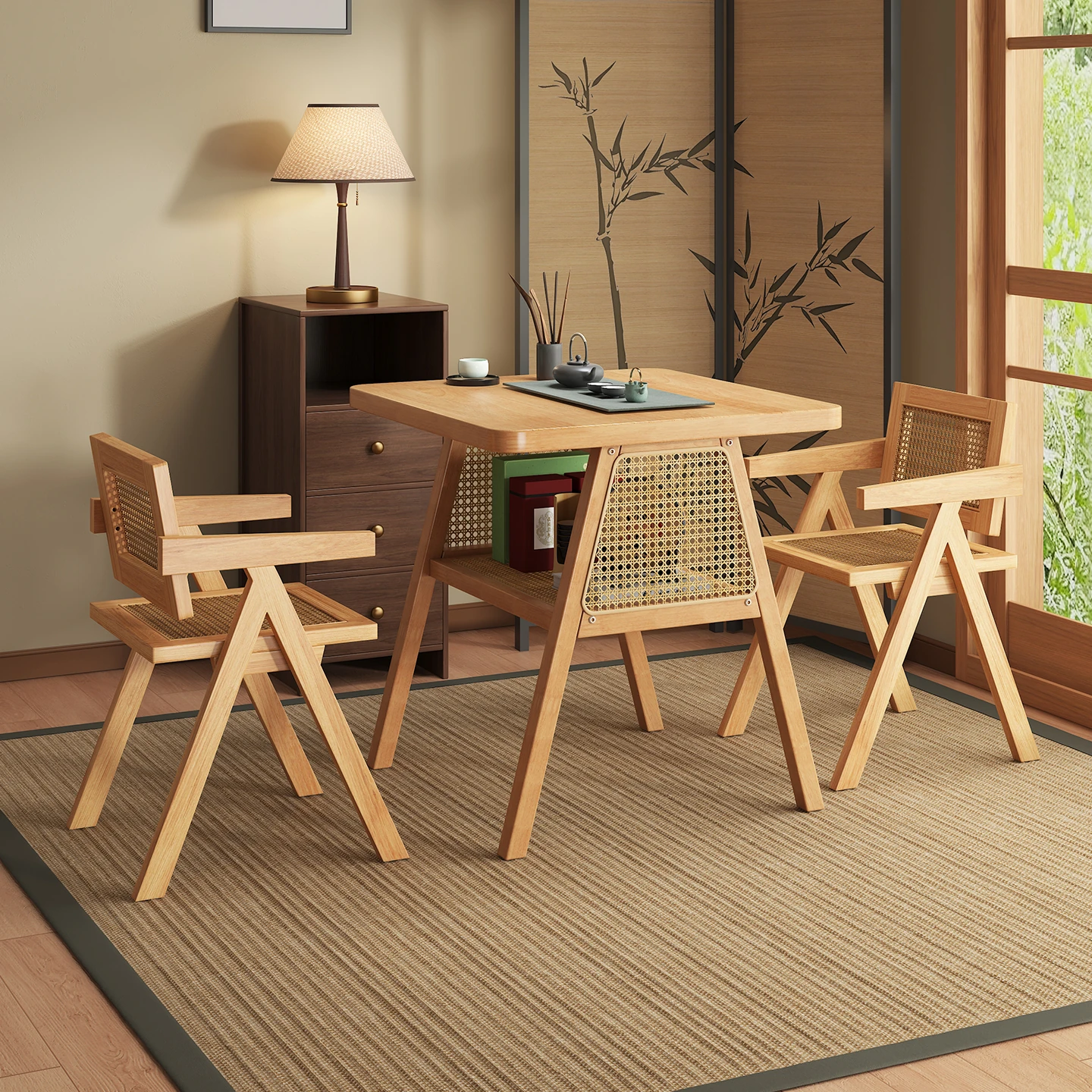 天然木製バルコニー茶卓セット - 新中式デザインの茶台とラタン製椅子3点セット、リビングルームに最適!小さなスペースにもぴったりのスタイリッシュで機能的な家具。