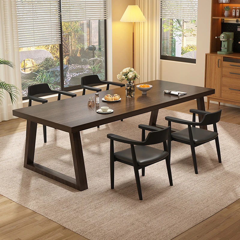 シンプルでスタイリッシュな黒胡桃の長方形ダイニングテーブル - 小型住宅に最適!4脚の椅子付きで、家族や友人との楽しい食事タイムを演出します。あなたのリビングに温かみと高級感をプラス!