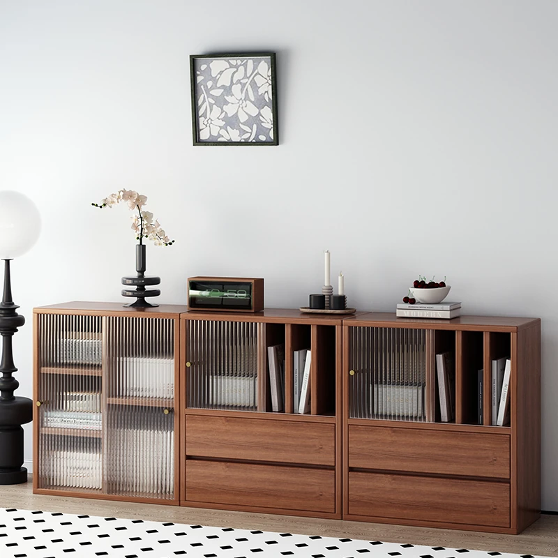 ウォールナット色の防塵引き出し付き収納モジュール、コンパクトなフロアタイプのグリッドキャビネット。リビングルームにぴったりなスリムデザインで、スタイリッシュに整理整頓!