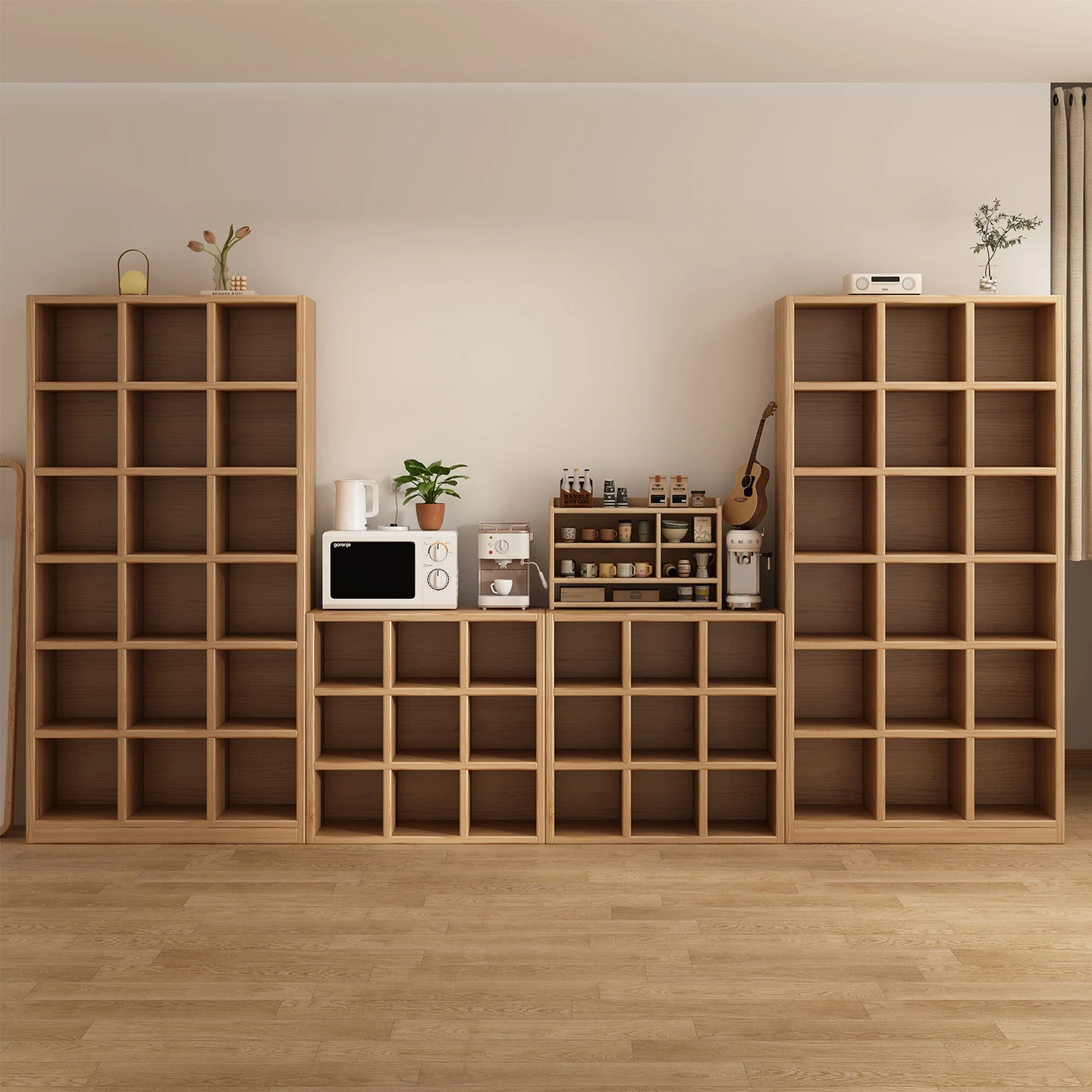 木の温もりを感じるデザインのリビング用展示キャビネット!収納力抜群で自由に組み合わせ可能な半壁書棚と格子棚。あなたのインテリアにぴったりのスタイリッシュな収納ソリューション!