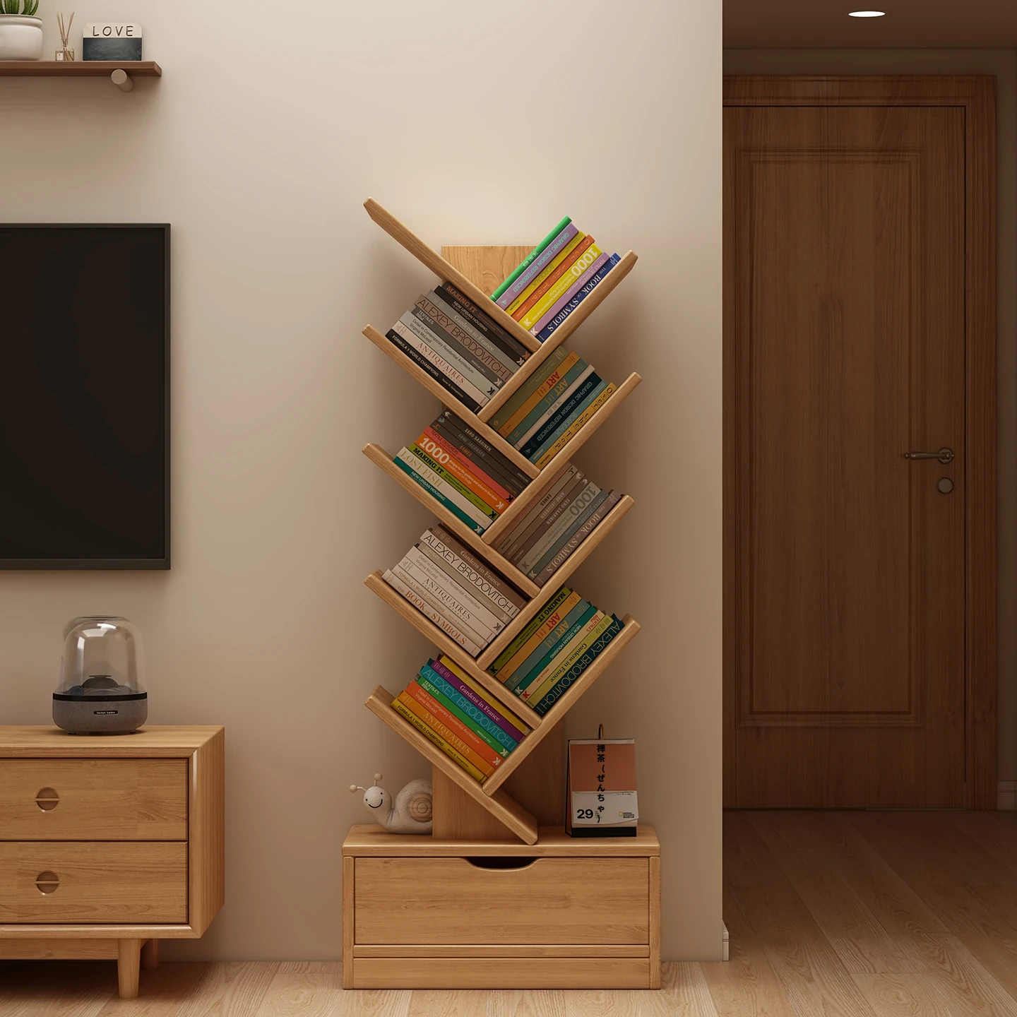 壁にぴったり寄せられる、スタイリッシュなフロアシェルフ!リビングや学生の部屋に最適な収納力抜群の実木製ブックキャビネット。おしゃれで機能的、あなたの空間をすっきり整えます!